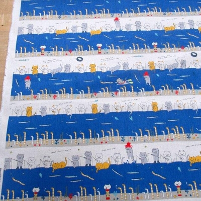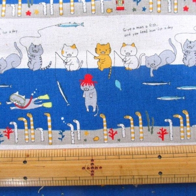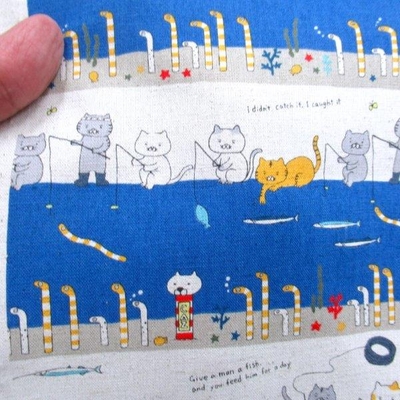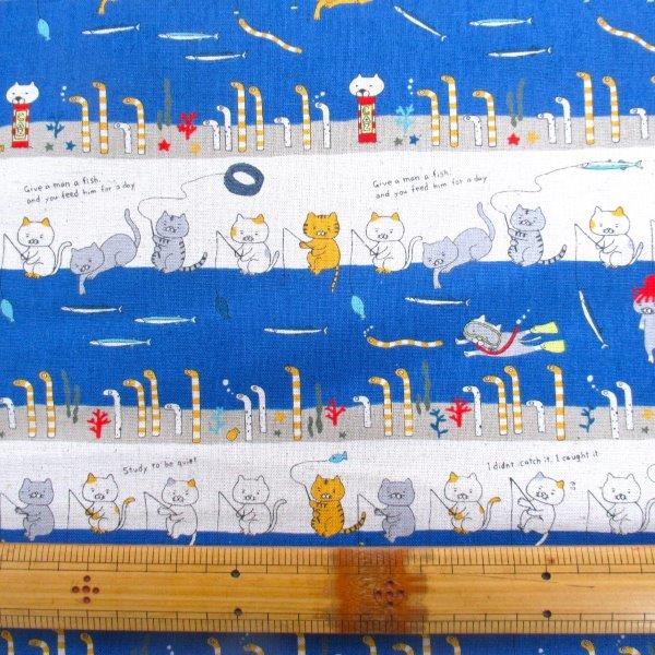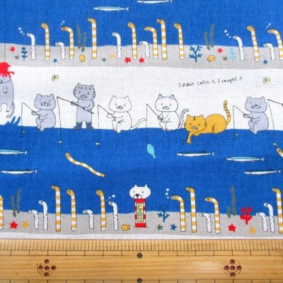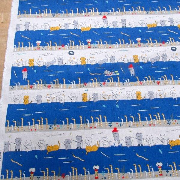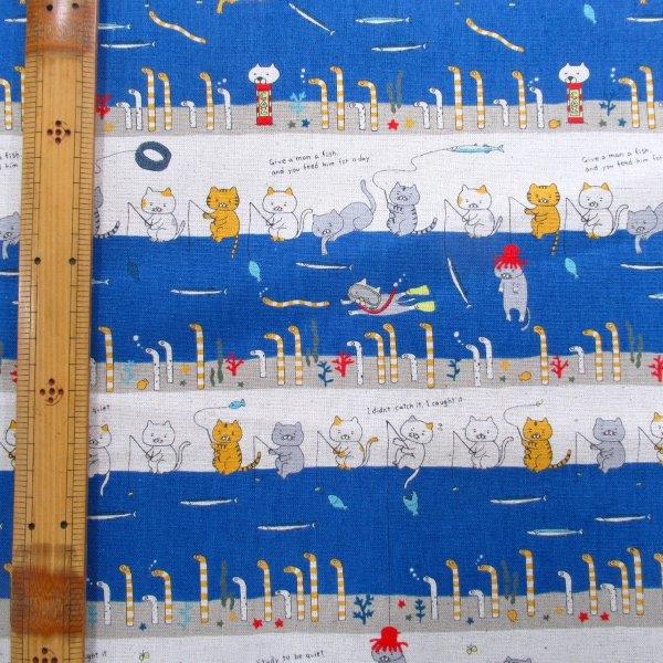 釣り猫 綿麻キャンパス ブルー系色 (9674 猫)
